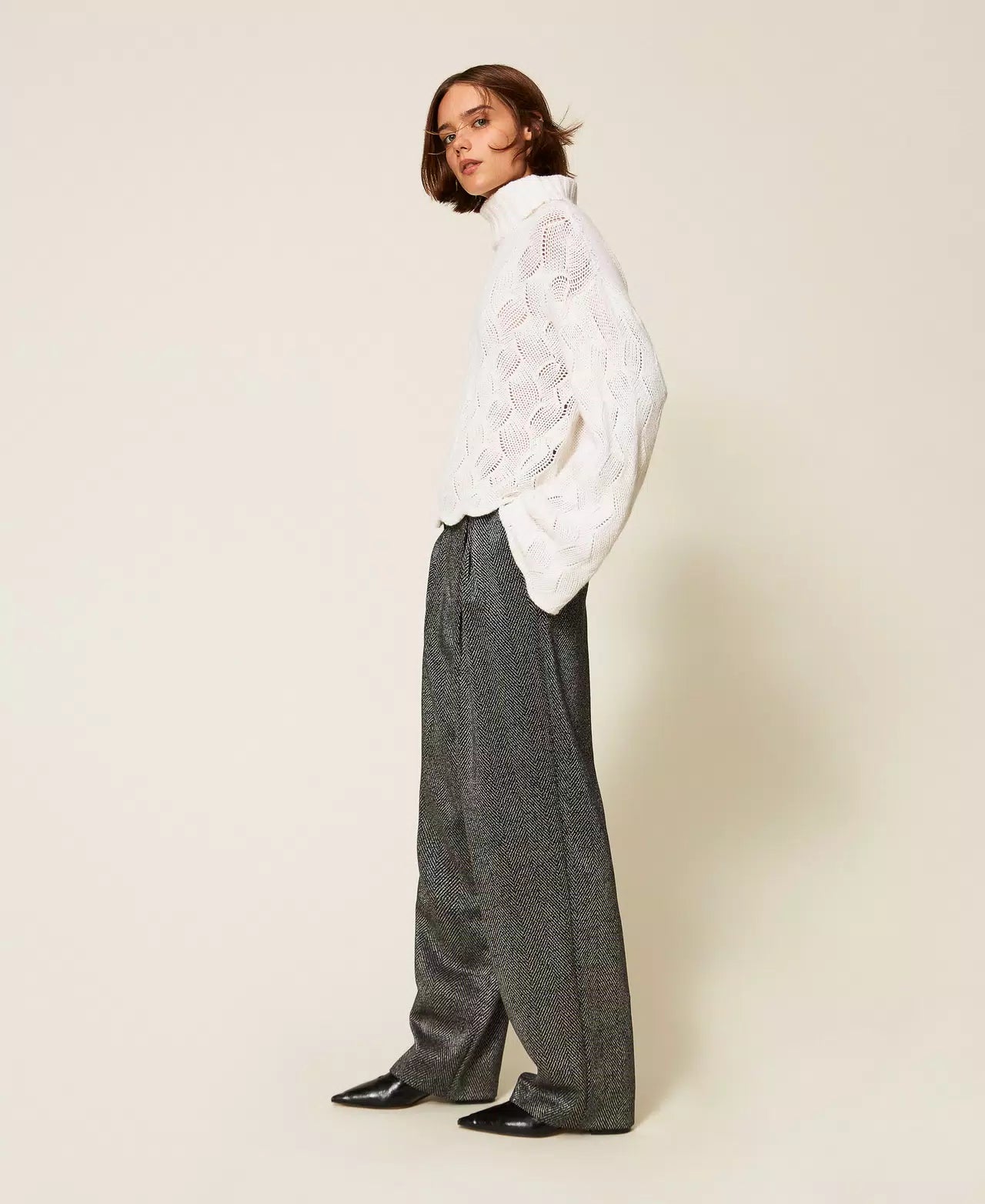 Елегантен панталон в palazzo кройка с двойна предна плоха и коси джобове. Ламиниран херингбон принт в черно придава модерен акцент.